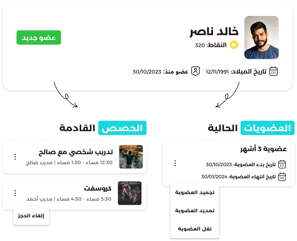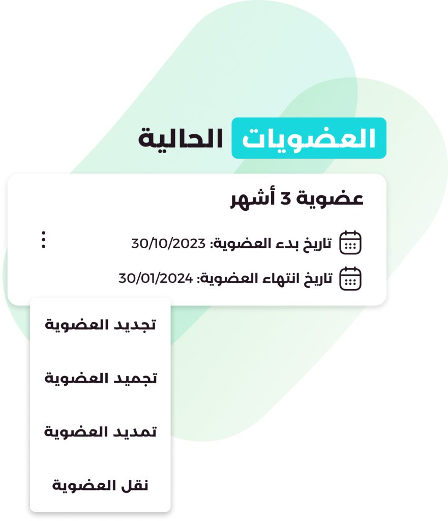 إدارة عضويات النادي الرياضي لم تكن أبدًا بهذه البساطة. تحكم بالكامل باستخدام ميزة إدارة العضويات لدينا، مما يتيح لأصحاب النوادي الرياضية التعامل بسرعة وسهولة مع العضويات. يمكنك تجميد، تمديد، أو نقل العضويات بسهولة، مما يوفر مرونة لكل من أصحاب النوادي والأعضاء.